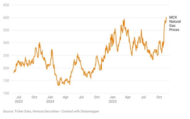By early 2025, however, the tide began to turn. Colder weather boosted heating demand just as U.S. liquefied natural gas (LNG) exports accelerated, channeling more American gas toward energy-hungry Europe and Asia. The combination of firmer demand and tightening storage balances ignited a sharp rebound. By January–February 2025, Henry Hub prices had climbed above $4.00 per MMBtu, while MCX prices surged to a high of ₹394.20, nearly doubling from the previous year’s lows.