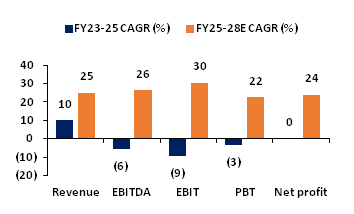 The company reported FY25 net revenue of INR 319 cr and targets INR 450-480 cr in FY26, INR 550-600 cr in FY27 and ~INR 1300 cr by FY30. ARR is expected to grow 5-8% with ~75% occupancy. The current gross debt is INR 100 cr, and ROHL aims for an asset-light model, using FCF selectively for expansion and debt repayment, primarily relying on internal accruals for growth. Over FY25-28E, ROHL’s revenue, EBITDA & net earnings are projected to grow at a CAGR of 24.8%, 26.2% & 23.8%, respectively, reaching INR 621 cr, INR 147 cr & INR 90 cr. Our estimates are lower than management targets as we have taken a conservative approach in our forecast. EBITDA margins are expected to expand by 80bps to 23.7%, while net margins could decline by 34bps to 14.4% due to an increase in lease expenses. Strong operating performance is expected to improve return ratios - RoE & RoIC could improve by 110bps to 21.6% and 660bps to 25.7% by FY28E