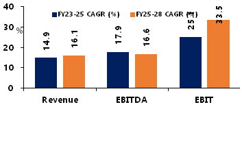 We project revenue growth at a CAGR of 16.1%, from INR 3,254 cr in FY25 to INR 5,094 cr by FY28, largely driven by :