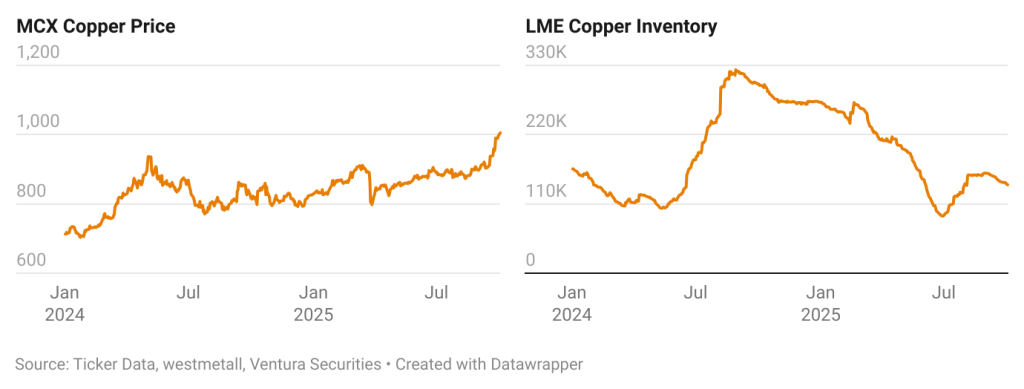 Copper on MCX has been in a firm uptrend since April 2025, supported by a series of supply-side shocks. After hitting a low of ₹795.20 on April 8, copper prices have gained steadily through the summer, with momentum accelerating in recent weeks. Just yesterday, MCX copper price today touched a fresh high of ₹1,026.45, while on the LME, copper prices briefly broke above the symbolic $11,000 mark. The latest rally has been fueled by news of Codelco copper output falling to its lowest level in over two decades following a deadly mine collapse in Chile in July, compounded by Freeport-McMoRan’s earlier declaration of force majeure at its Grasberg mine, the world’s second-largest copper operation.