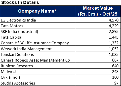The Stock-In list shows high-value allocations into LG Electronics India (₹4,570 crore), Tata Motors (₹4,229 crore), SKF India (₹2,895 crore) and Tata Capital (₹1,445 crore). These positions were not present at comparable scale the previous month, signalling a shift toward automobiles, industrials, and diversified financials. Smaller but meaningful entries included Canara HSBC Life (₹1,332 crore), Wework India (₹1,052 crore), Lenskart (₹1,035 crore) and Rubicon Research (₹640 crore).