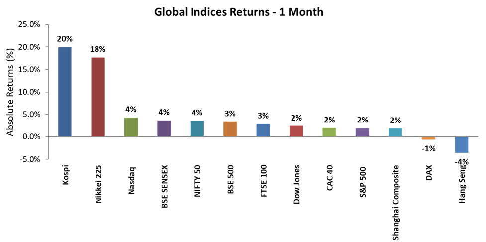 Global markets displayed notable divergence in performance. The KOSPI Index delivered a standout 20% return, followed by Nikkei 225 at 18%. U.S. markets were comparatively muted, with the Dow Jones returning 2% and the S&P 500 around 2%. Europe remained mixed: Germany’s DAX declined by 1%, while the FTSE 100 and CAC 40 posted modest gains of 2–3%. Meanwhile, the Hang Seng Index fell 4%, reflecting continuing macro and liquidity challenges in Hong Kong. The monthly Indices returns across regions highlighted the importance of selective global allocation and underscored India’s relative stability during the period.