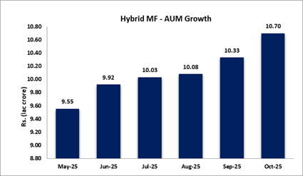Equity AUM increased from ₹33.73 lakh crore in September 2025 to ₹35.21 lakh crore in October 2025, representing a +4.38% MoM growth. The Debt AUM trajectory strengthened materially, rising from ₹18.01 lakh crore to ₹19.73 lakh crore, a +9.57% MoM increase. Hybrid schemes reported a steady uptick as well, with AUM moving from ₹10.33 lakh crore to ₹10.70 lakh crore (+3.58% MoM). These three segments combined indicate a net AUM expansion driven by NAV appreciation and incremental net inflows.