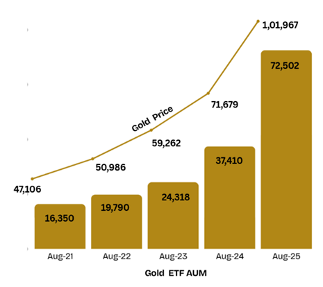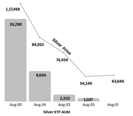 Note: Considered Gold and Silver ETF AUM for the past 5 years, along with gold (10gms) and silver(1Kg) prices as of 31st Aug for each of those years.