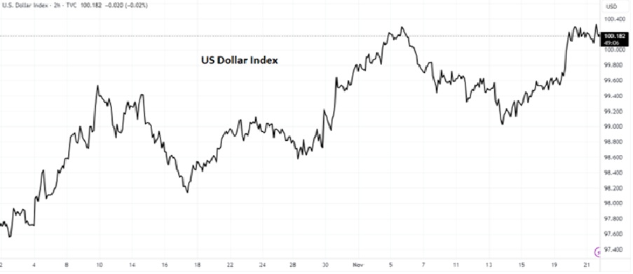The Dollar Index broke decisively above the key 100 level on 19 November and has held that breakout, a move that stood out given how firm a psychological barrier 100 has been throughout the year. The surge reflects a clear shift in macro sentiment, with markets sharply dialling back expectations of a December Fed rate cut as fresh economic data, including stronger September jobs numbers, came in better than feared after the shutdown. At the same time, a sharp slide in the yen driven by mounting fiscal concerns has added further upward pressure on the index, especially since the yen carries the second-highest weight after the euro.