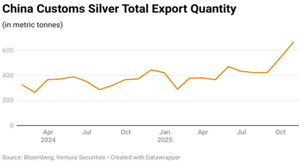China exported more than 660 tons of silver in October, the highest monthly volume ever, further tightening domestic supply.