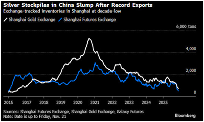 Chinese silver inventories have dropped significantly in recent weeks, with stockpiles in warehouses linked to the Shanghai Futures Exchange now sitting at their lowest levels since 2015. This steep decline in available metal is raising fresh supply concerns in the world’s largest manufacturing hub.