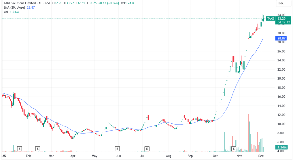 In the last 3 months, the stock price of Take Solutions has given multibagger returns of 200%. Over the past year and six months, the company has produced returns of 94% and 289%, respectively.